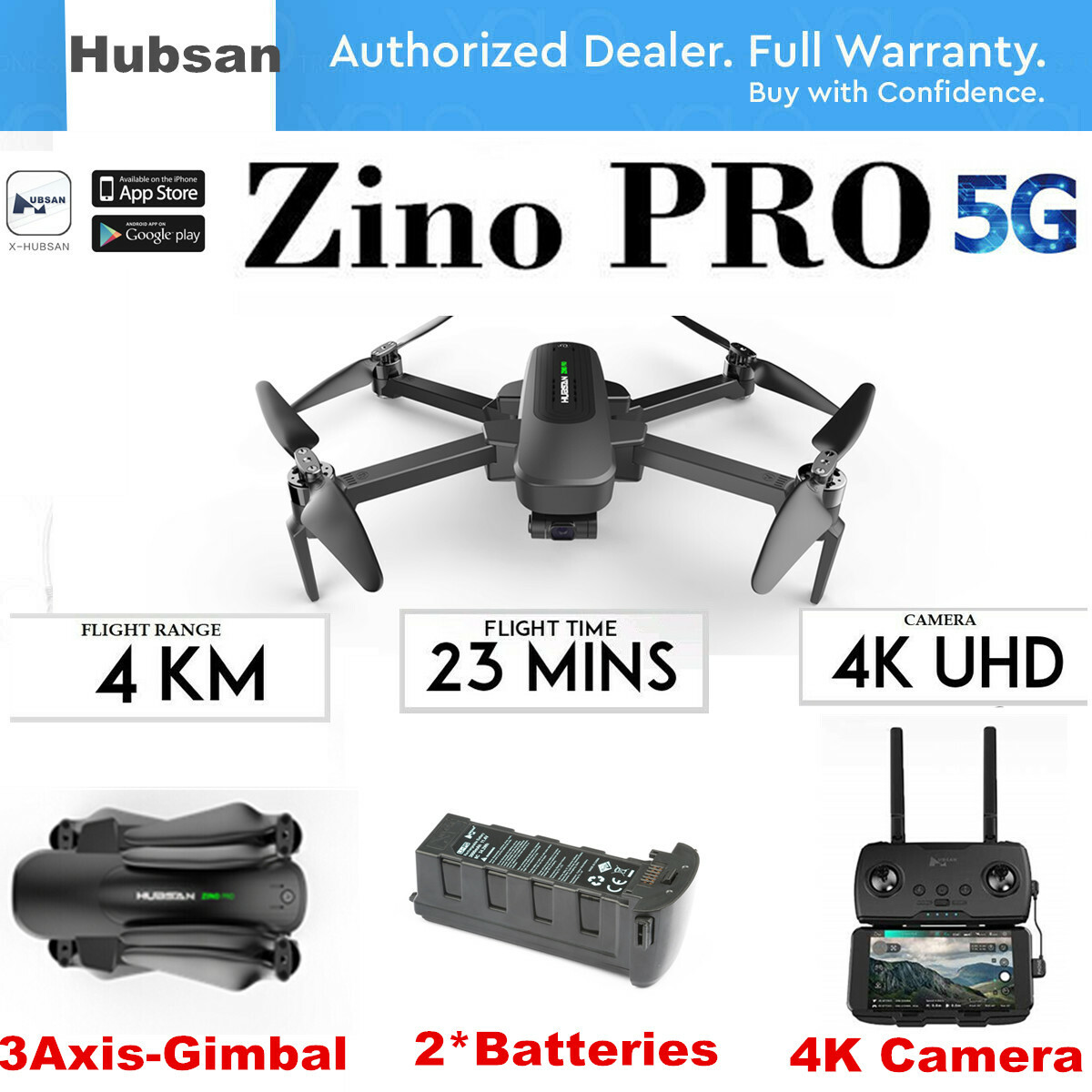 Hubsan Zino PRO APP GPS Drone W/4K FPV 5G Wifi Bruhsless 3-Axis Gimbal+2 Battery
